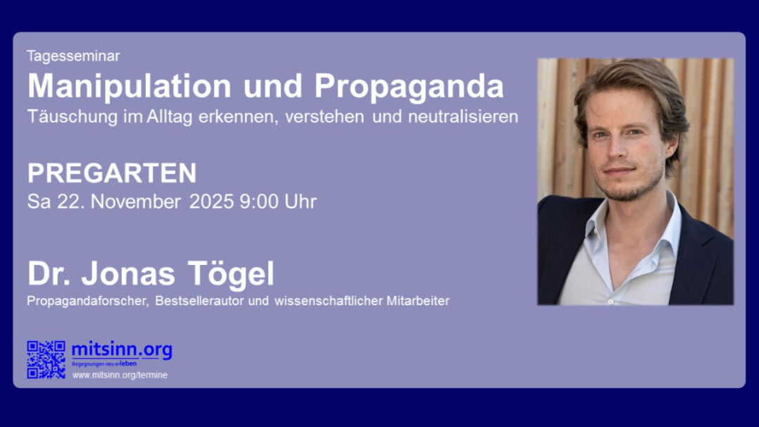 Im Vortrag bzw. Tagesseminar möchte Dr. Tögel den Menschen helfen, Manipulation zu erkennen, zu verstehen und zu neutralisieren. Er betont die Bedeutung von Resilienz und innerer Stärke, um auch in schwierigen Zeiten friedlich und positiv in die Zukunft blicken zu können. Damit wir gemeinsam das zurückholen, was am wichtigsten ist: echte Demokratie auf Augenhöhe und ein friedliches Miteinander ohne Kriege und Gewalt.